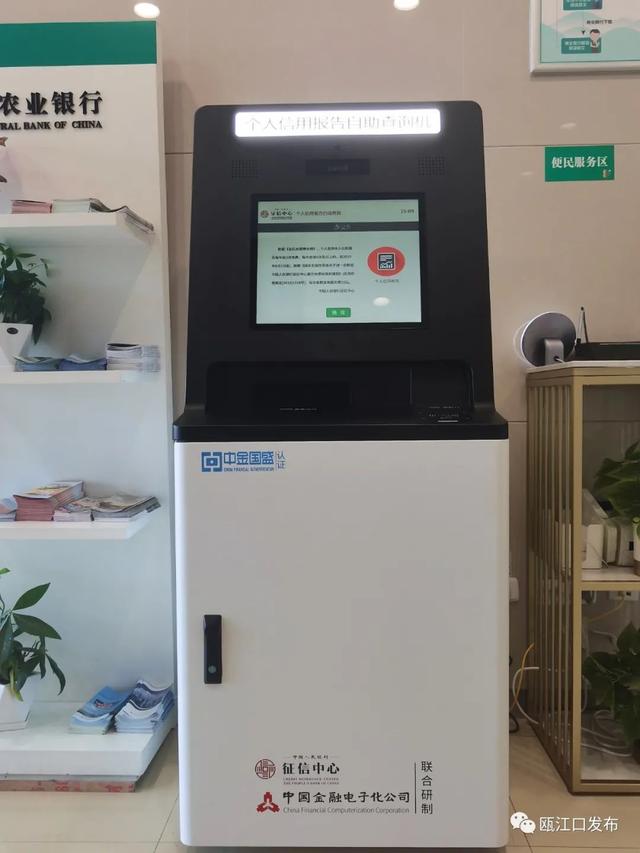 自助查詢(xún)機(jī)布置在中國(guó)農(nóng)業(yè)銀行溫州甌江口支行營(yíng)業(yè)廳,由專(zhuān)人負(fù)責(zé)引導(dǎo),查詢(xún)?nèi)酥恍璩直救擞行Ф矸葑C,通過(guò)讀取身份證及“人像識(shí)別”即可實(shí)現(xiàn)一分鐘查詢(xún)并打印本人信用報(bào)告。